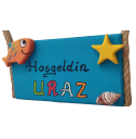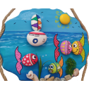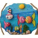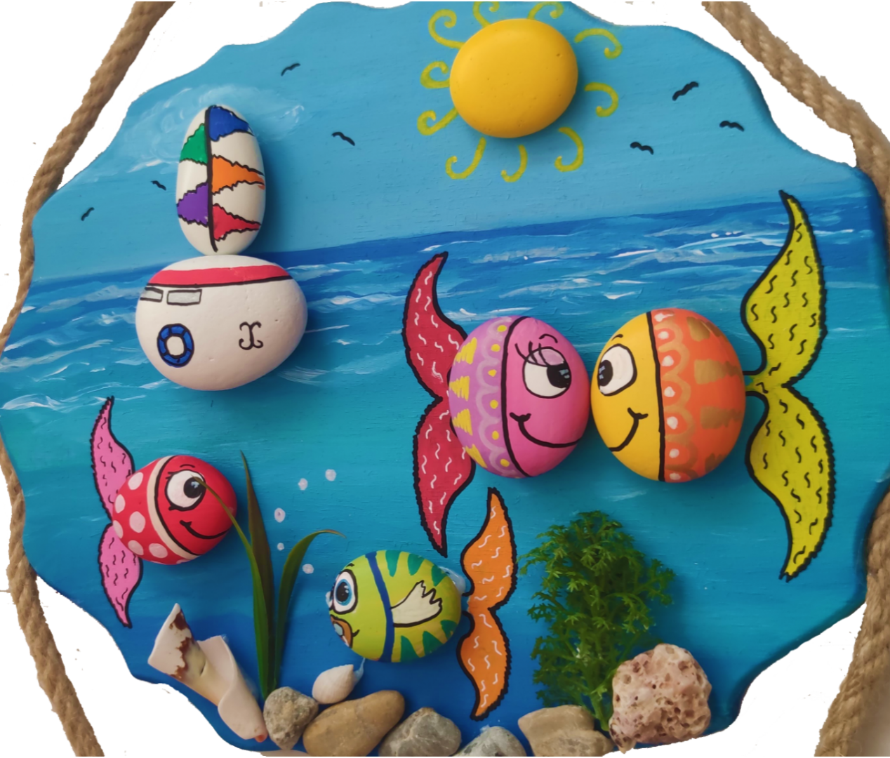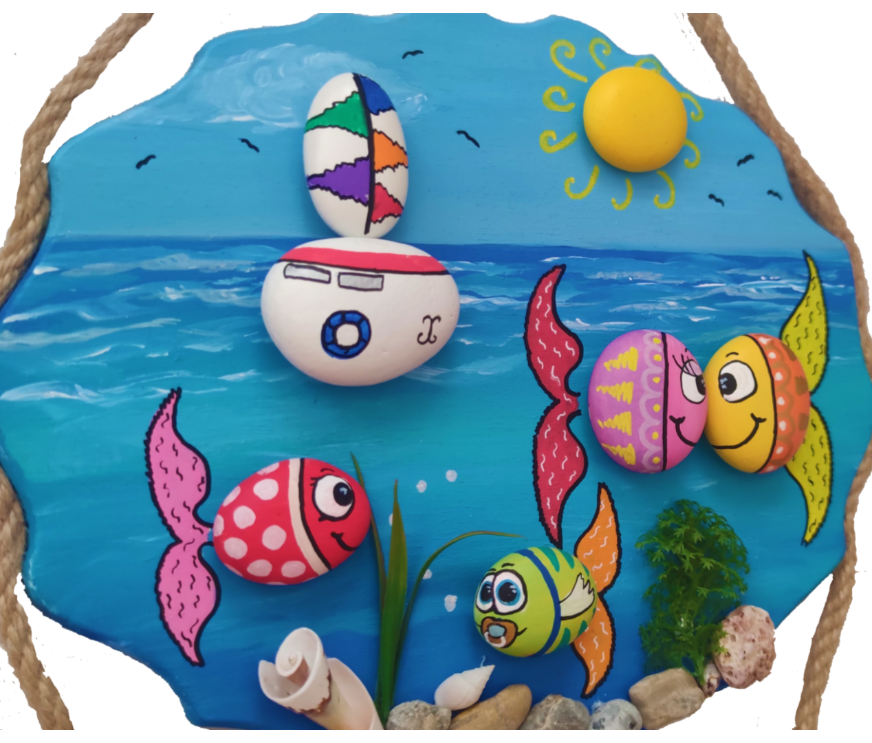 Oval Ahşap Taş Tablo Akvaryum Balık Ailesi Bebek Kapı&Duvar Süsü