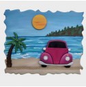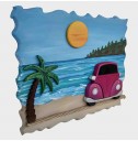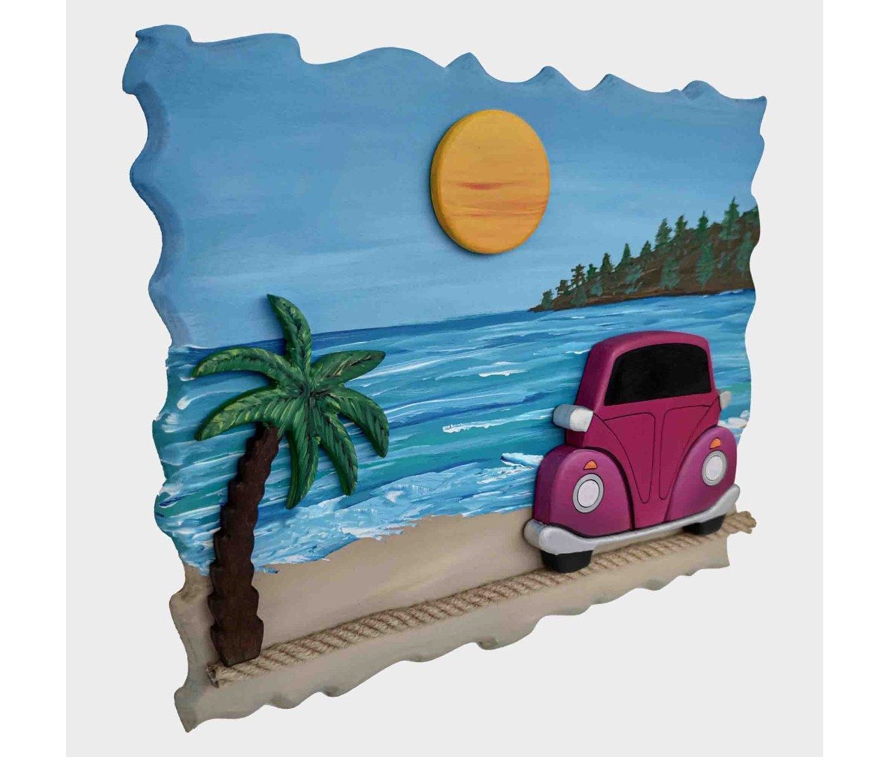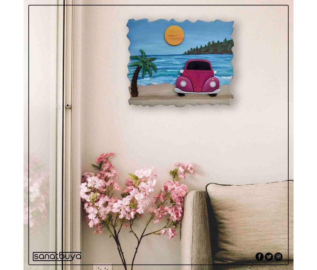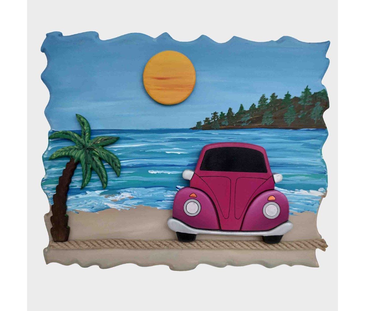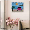 3 Boyutlu Sahil Manzaralı Ahşap Araba Tablosu (Fuşya Vosvos)
