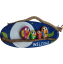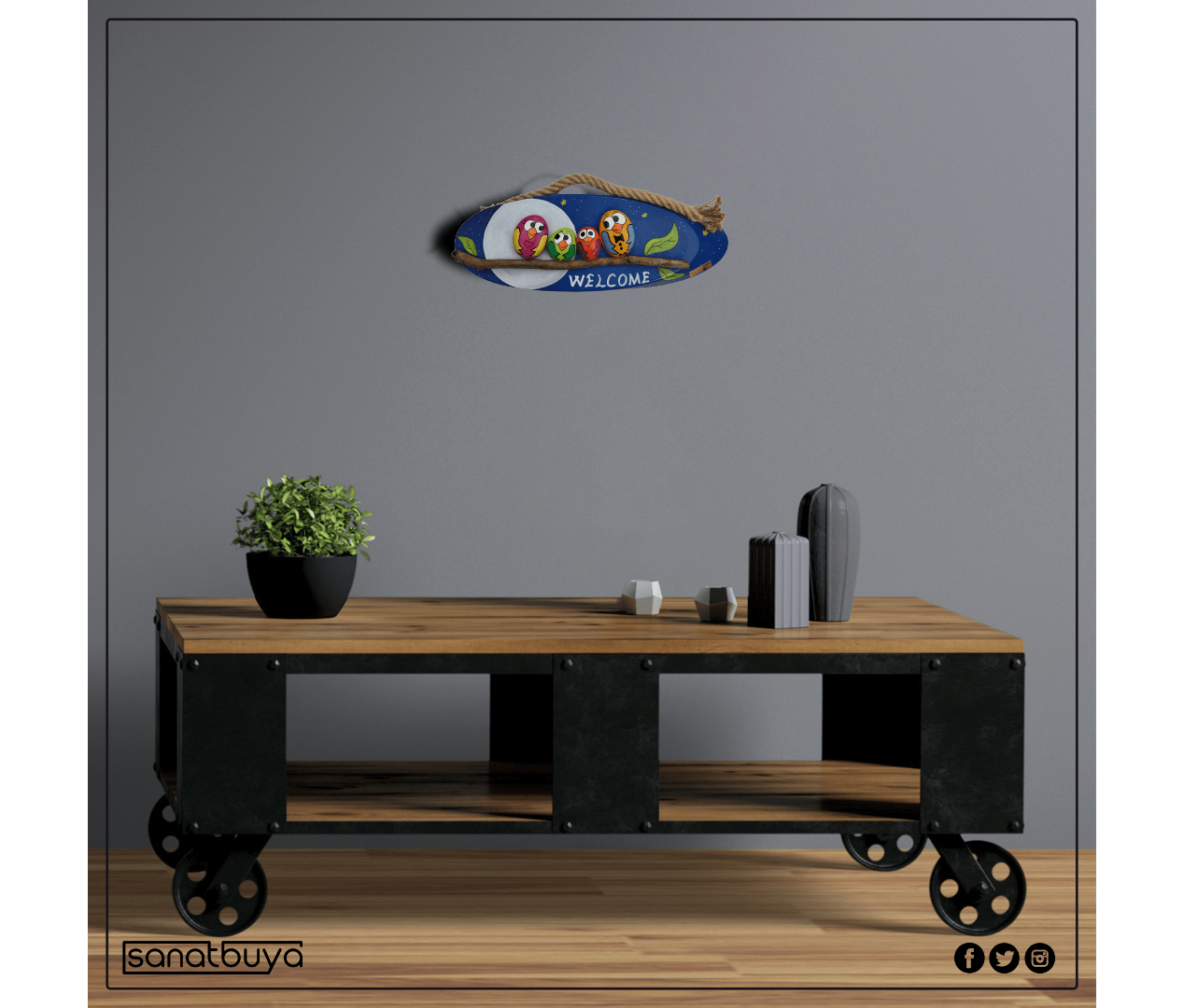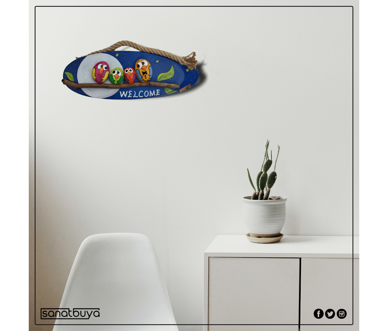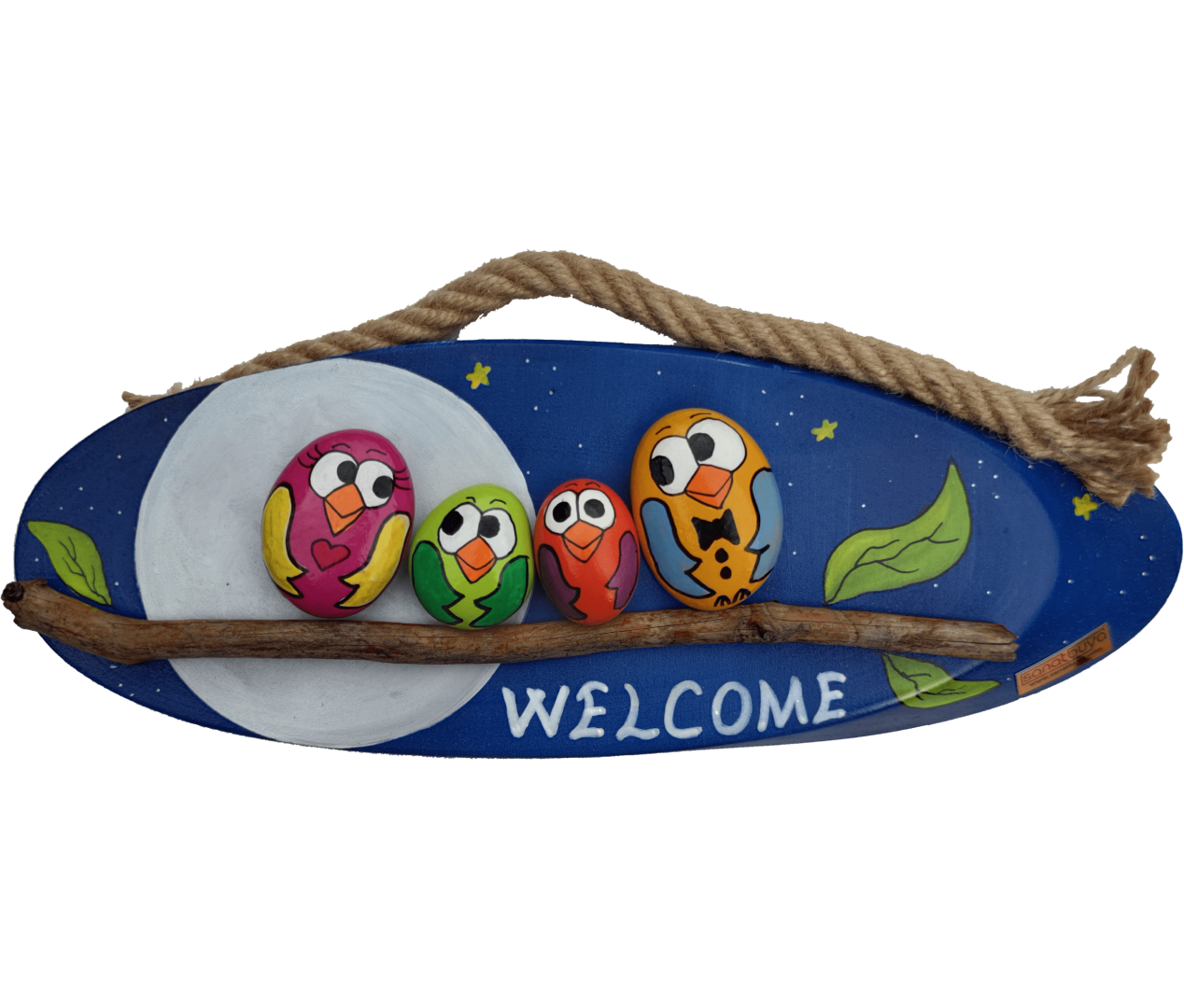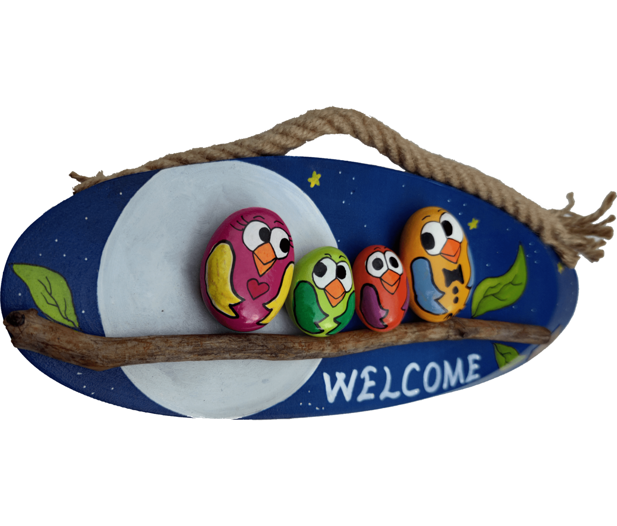 Yatay Kütük Taş Boyama Tablo Baykuş Aile 4'lü Gece