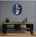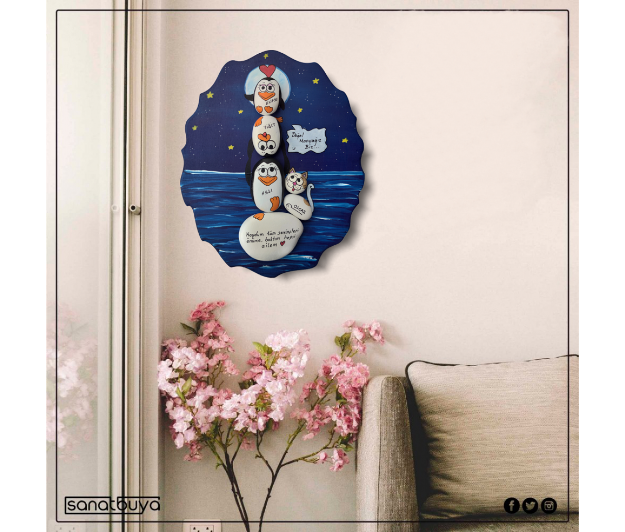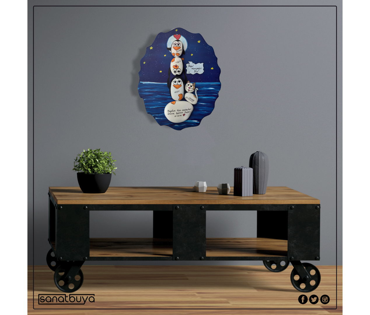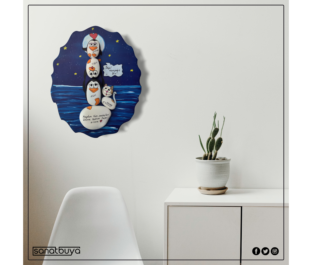 Oval Ahşap Taş Tablo Orta Boy Penguen Aile Karikatür